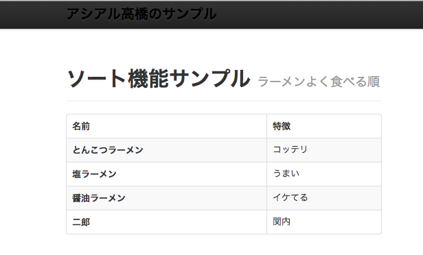 tableのclassがごちゃごちゃしてますが、これはTwitter Bootstrap用です。