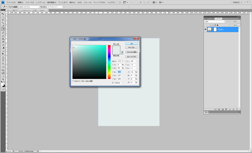 アプリケーションメニューから【レイヤー > 新規塗りつぶしレイヤー > べた塗り】で【#e4edec】の色で設定します。
