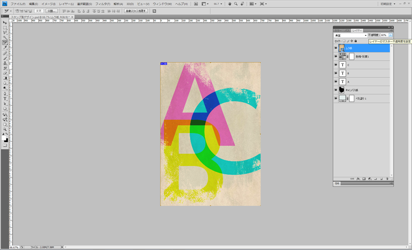 レイヤーパネルにある、描画モードを【乗算】に変更し不透明度を【60%】にします。