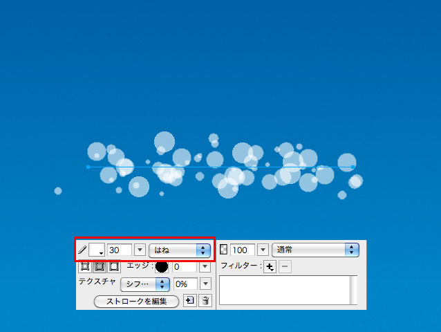 ・画面上:線幅:30px、線色:#FFFFFF、ブラシの:特殊ペン/広範囲のはね
