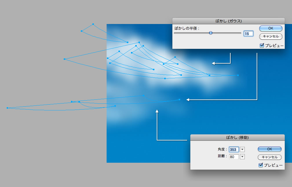 画面下の雲は遠いところにあるのをイメージしているので「ぼかし(移動)」も掛けてみました。