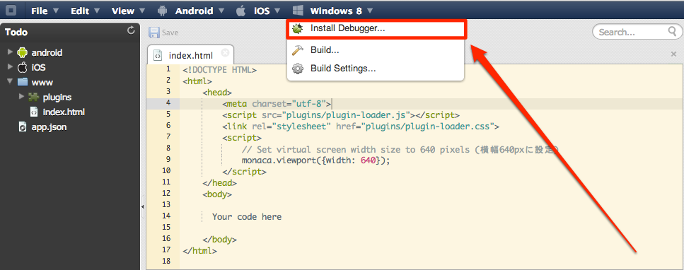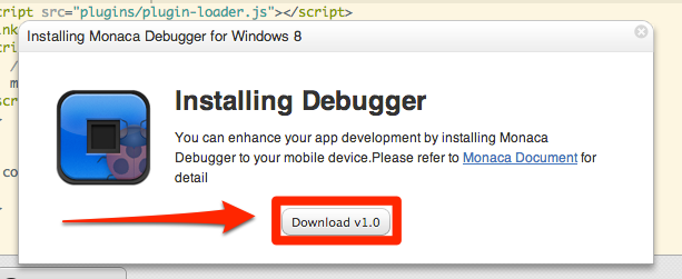 You can download the Monaca Debugger Windows8 Edition from the Monaca IDE, as shown in the figure below and install your Windows8 machine.