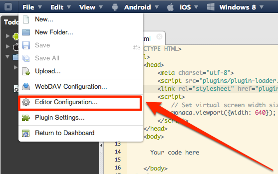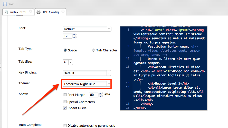 You can set up the color Theme of the Monaca IDE Editor as you like by editing Editor Configuration, as shown in the figure below.
