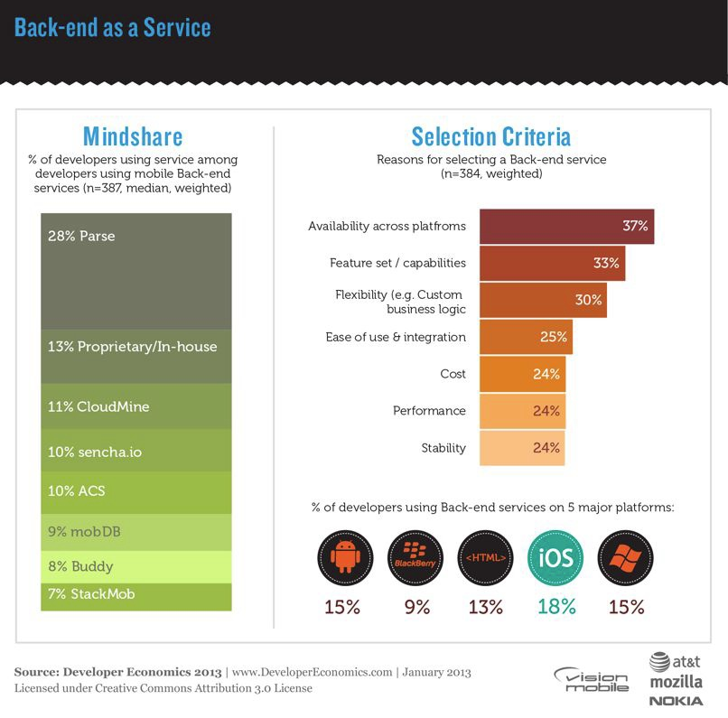 こちらは、Parseのシェアが28%とダントツで高いようです。2番手に来ているのはIn-house。外部ツールを使わずに自前でBaaSっぽいものを使っているとうことですかね。sencha.ioとACS、それぞれSenchaとAppceleratorが展開するBaaSです。CPTs側がバックエンドまで囲い込んでいくという流れができつつあるのかも知れないですね。このへんの動向はMonacaの事業開発を担当しているものとしては見逃せない流れです。