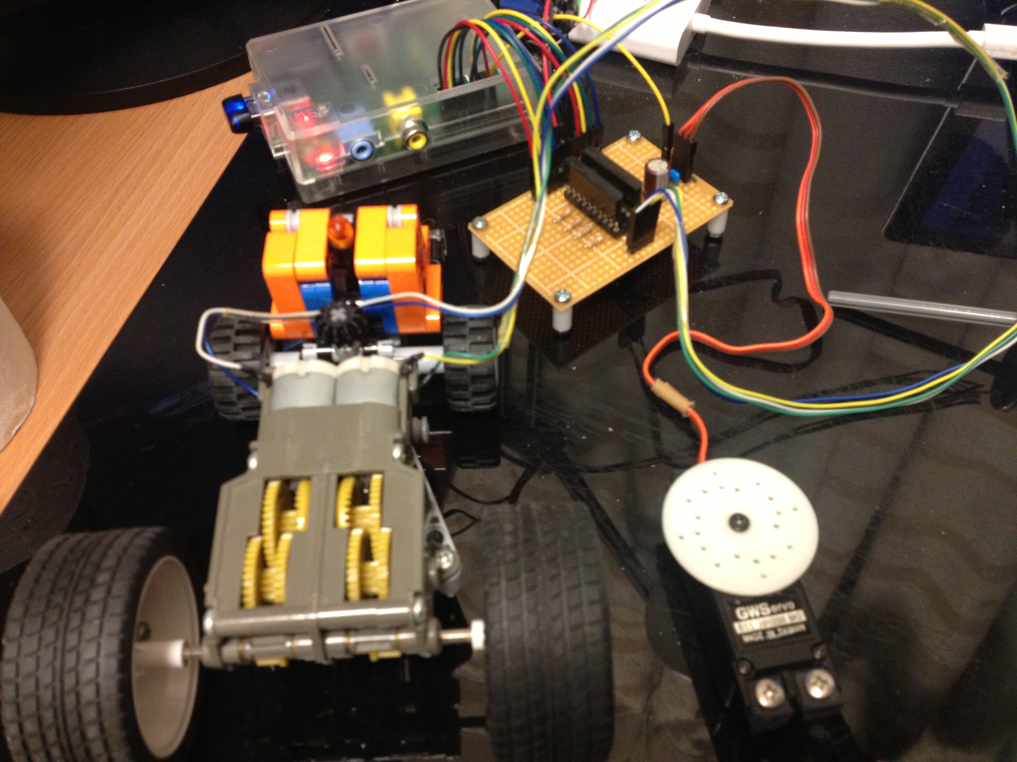 そして、サーボモーターにはRaspberry PiからのPWM信号を送ってやる必要がありますので、プログラムの修正、サーボモータードライブ回路の追加をしました(特別な回路を組んでいる訳ではないので省略)。