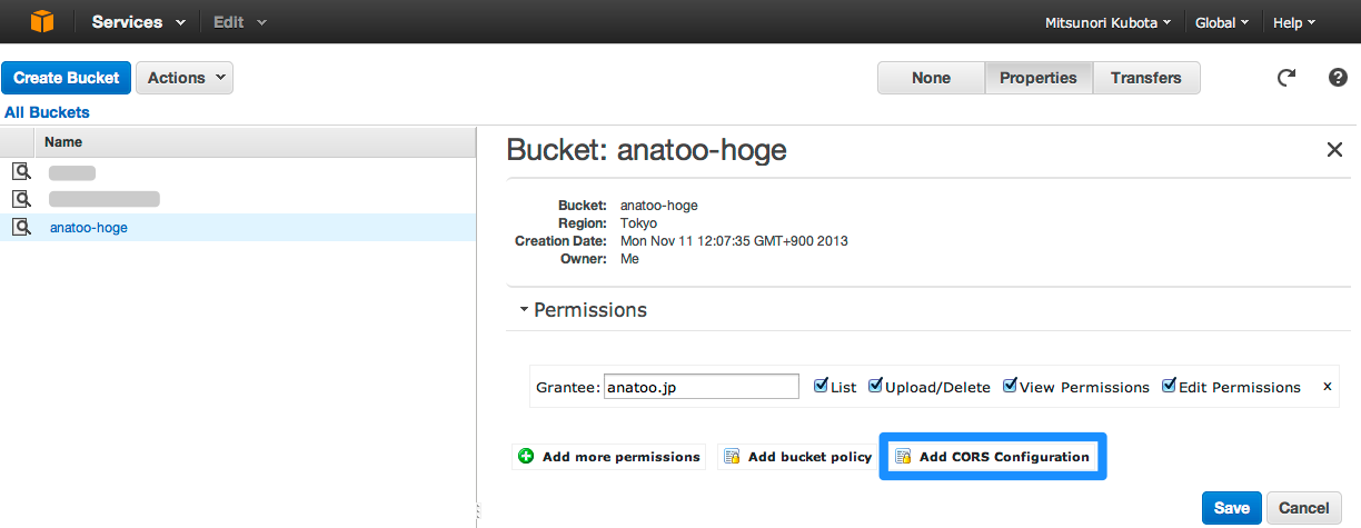 S3のバケットを作成したら、次にそのS3に対して他のドメインからAjaxでアクセスできるようにするために、CORS(Cross Origin Resource Sharering)を設定します。作成したBucketの詳細からPermissionsを選択して、「Add CORS Configulation」をクリックすると、CORSを設定ダイアログが表示されます。