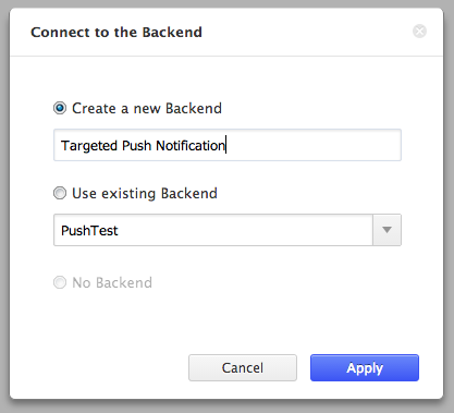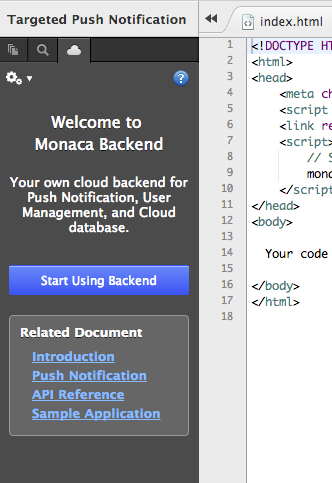 IDEの左サイドの上部にある「雲」アイコンをクリックして、「バックエンドを利用する」をクリックします。選択肢が出てくるので、「Monacaバックエンドを新規作成する」を選び新規バックエンドを作成するか、「既存のMonacaバックエンドを使用する」を選びます。