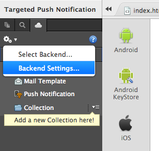 再度、左サイトの上部にある「雲」アイコンをクリックして、次に「歯車」アイコンをクリックし、バックエンド設定を選択します。