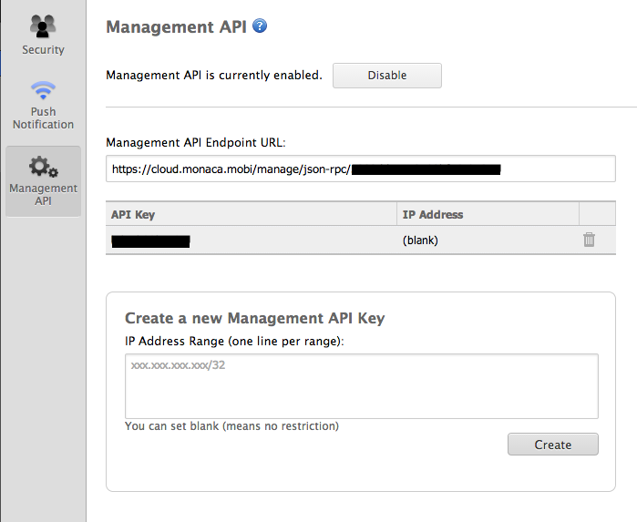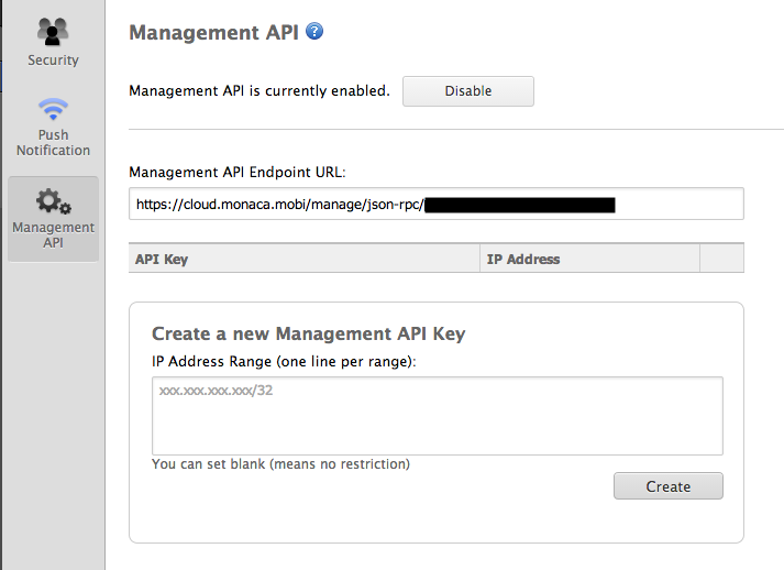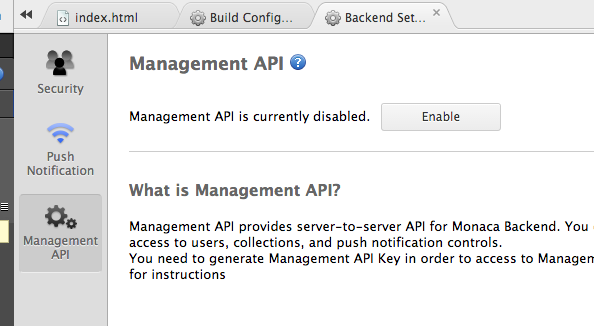 「有効にする」ボタンを押し、マネジメントAPIを有効にします。マネジメントAPIとは、HTTPS経由でJSON形 式のリクエストを送るだけでご自分のサーバからMonacaバックエンドを操作できる便利なWeb APIです。個別Push通知機能を利用するためには、マネジメントAPIの有効化が必須となります。