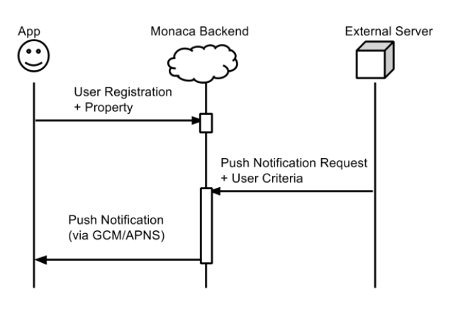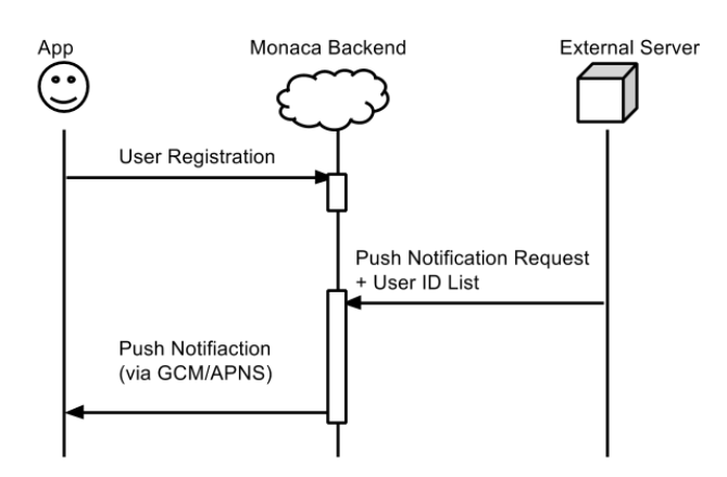 Monacaバックエンドの「ユーザID」を外部サーバにあらかじめ記憶しておきます。そのユーザIDのリストを指定すると、特定のユーザに対してのみ、プッシュ通知が行われます。