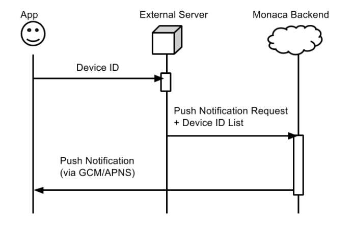 Monacaフレームワークはアプリ初回起動時にユニークな端末IDを自動生成します。この端末IDを外部サーバへ送り、独自のユーザ情報と紐付けておくことにより、特定の端末に対してのみ、プッシュ通知を行うことができます。