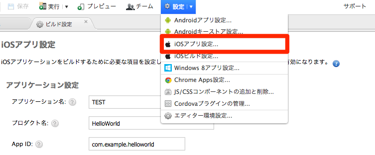 Monaca IDEでプロジェクトを開き上部メニューの「設定」から、「iOSアプリ設定」をクリックします。