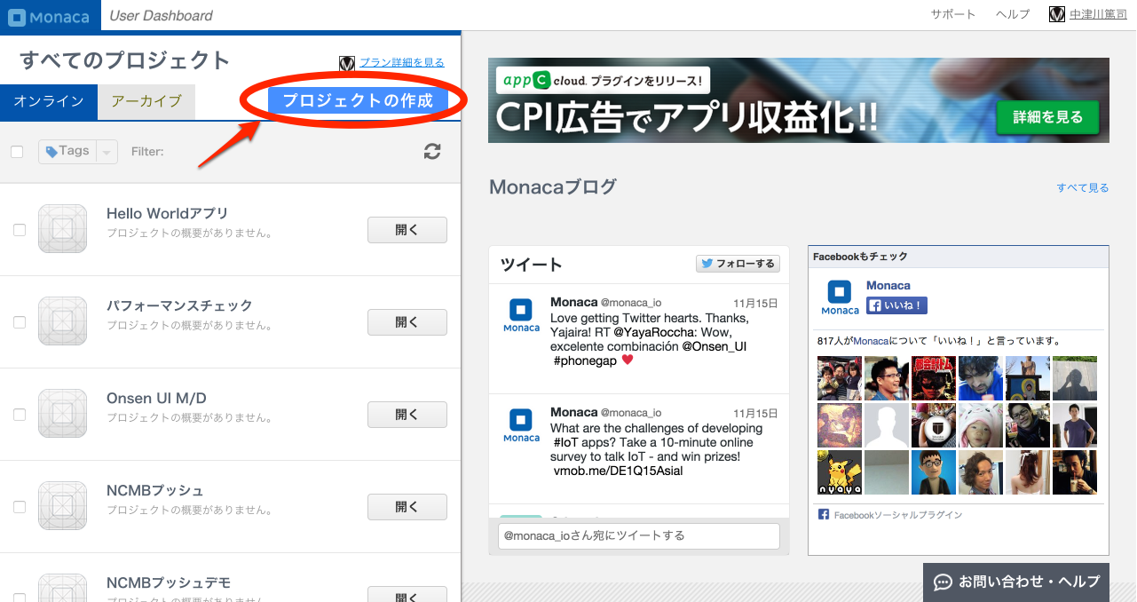 MonacaのIDはこちらから取得できます。