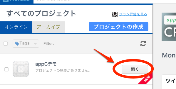 プロジェクトができあがったら、開くボタンを押して、Monaca IDEを立ち上げます。