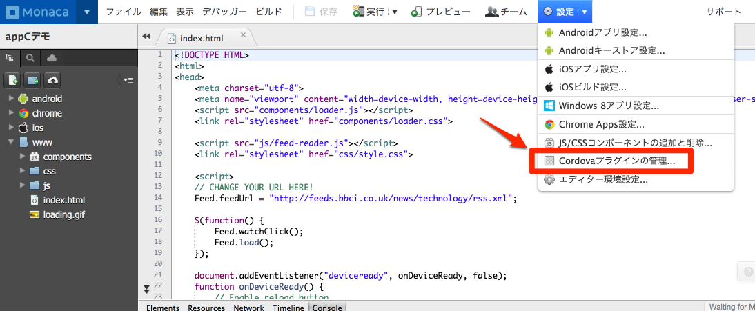Monaca IDEが開いたら、設定メニューのCordovaプラグインの管理を選択します。