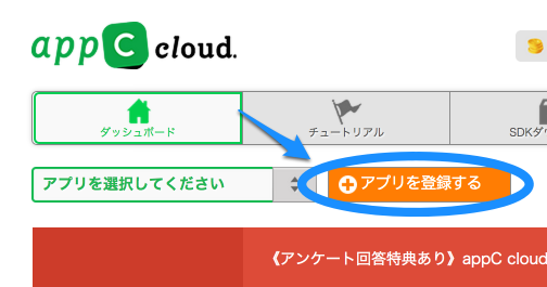 次はappC cloudでの作業です。appC cloudを開き、ログインしてください。ダッシュボードに入ったら、アプリを登録するボタンをクリックします。