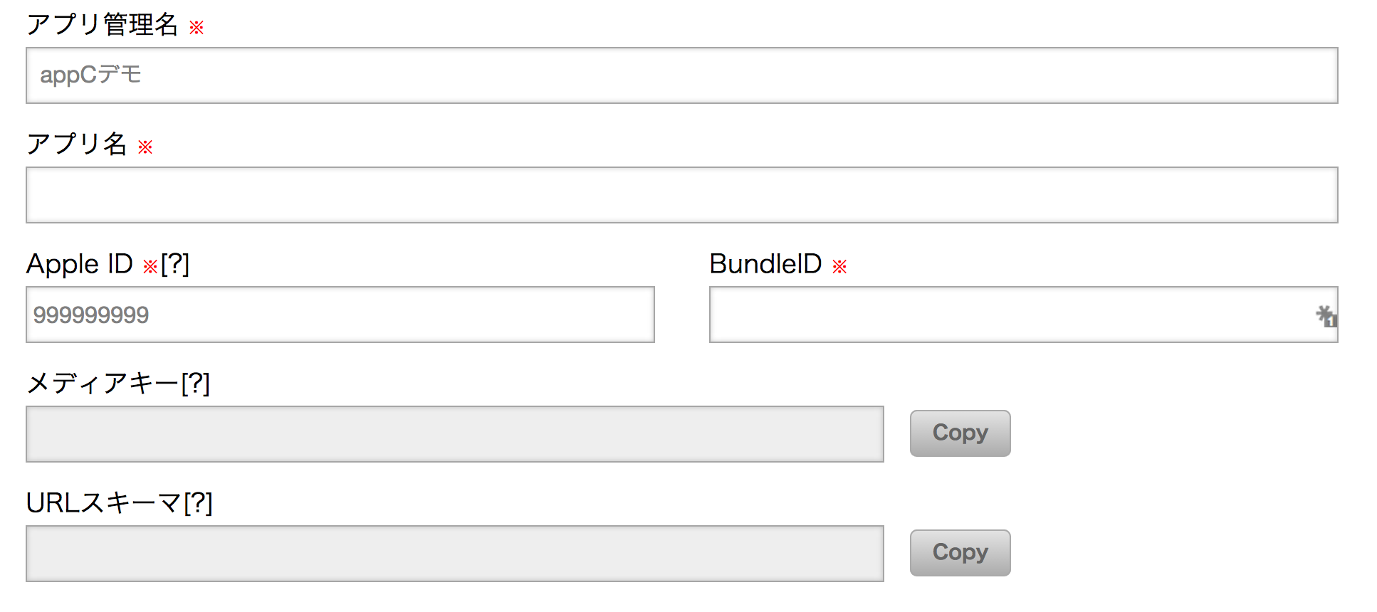 アプリ詳細設定画面で、アプリ名、Apple ID、BundleIDを入力してください。