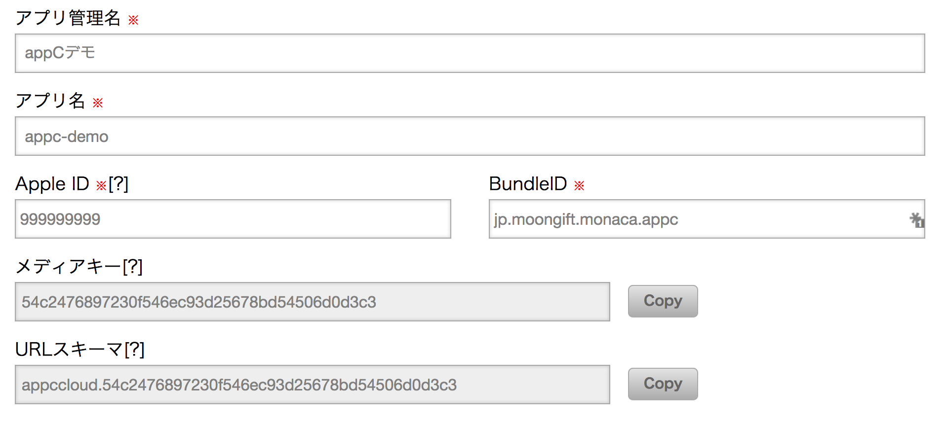 アプリ名は分かりやすいもの(Monacaと合わせるなど)を設定してください。
