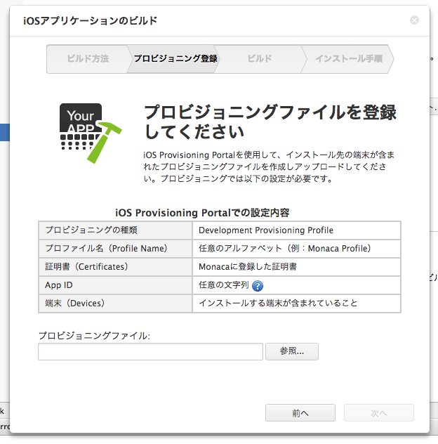 appC cloudはMonacaデバッガーでは確認できないようになっています。iOSビルド設定を行って、ビルドしてください。この記事中ではビルド設定の詳細は省きますが、appC cloudで設定したBundleIDをiOS Dev Centerで登録し、そのプロビジョニングファイルを使うようにします。また、アプリ設定ページでも同様にApp IDにBundleIDを指定してください。