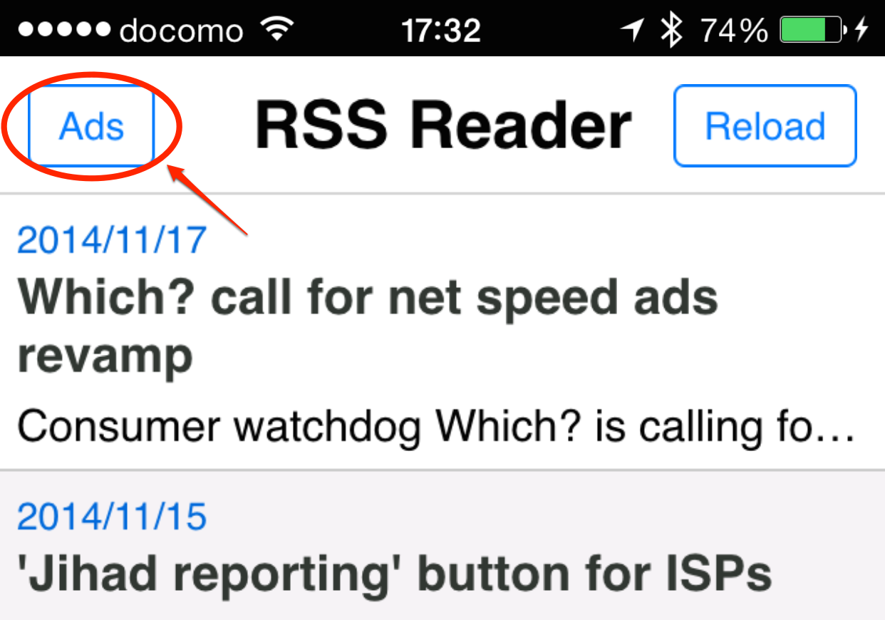 今回はこの左上のAdsボタンに広告表示イベントをつけています。メソッドを実行するだけなので、アプリ起動時や何かのイベントの終了時など自由に設定ができるでしょう。