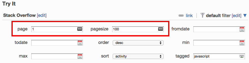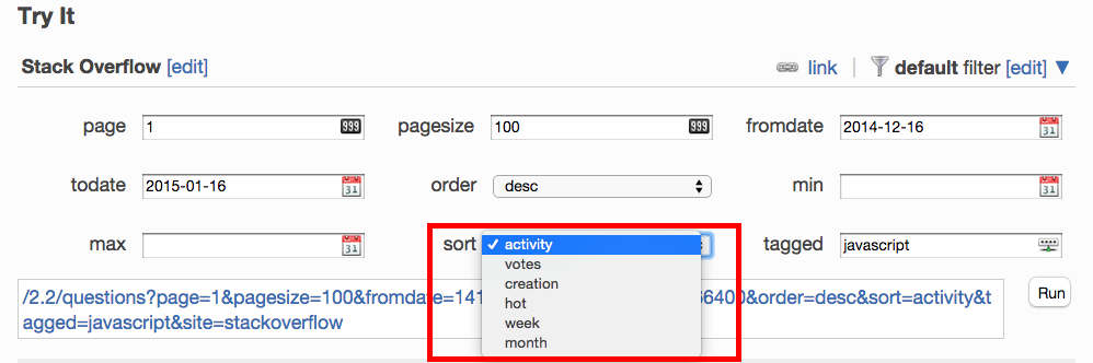 まず、https://api.stackexchange.com/docs/questionsにアクセスして、tagged欄に「javascript」を入力します。