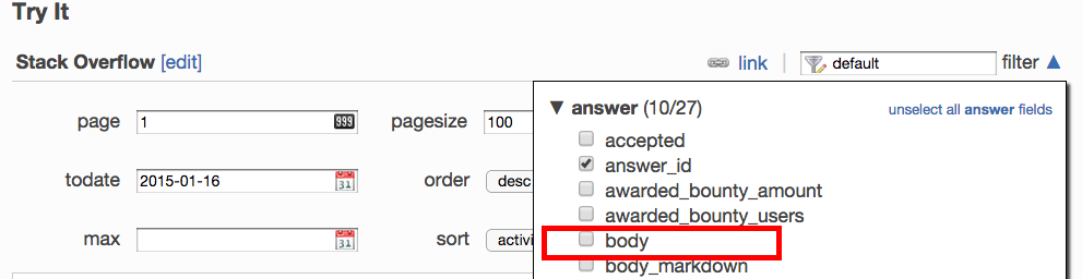 「フィルター」を利用することによって、回答の取得ができるようになっています。フィルターの「edit」ボタンをクリックして、「answer」→「body」にチェックすることで取得できるようなります。