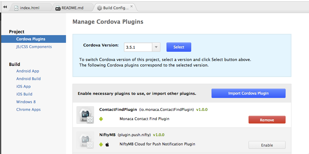 - In addition to Cordova 3.5, Cordova 4.1 can also be selected.