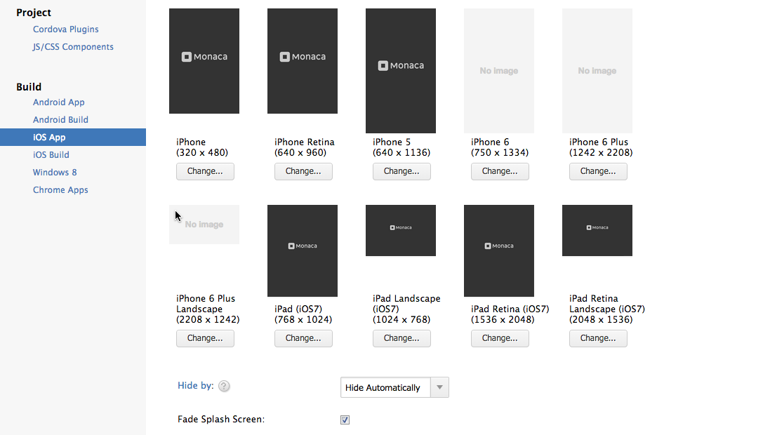 - Icons and splash screens for iPhone 6 and iPhone 6 Plus can be configured from Monaca IDE.