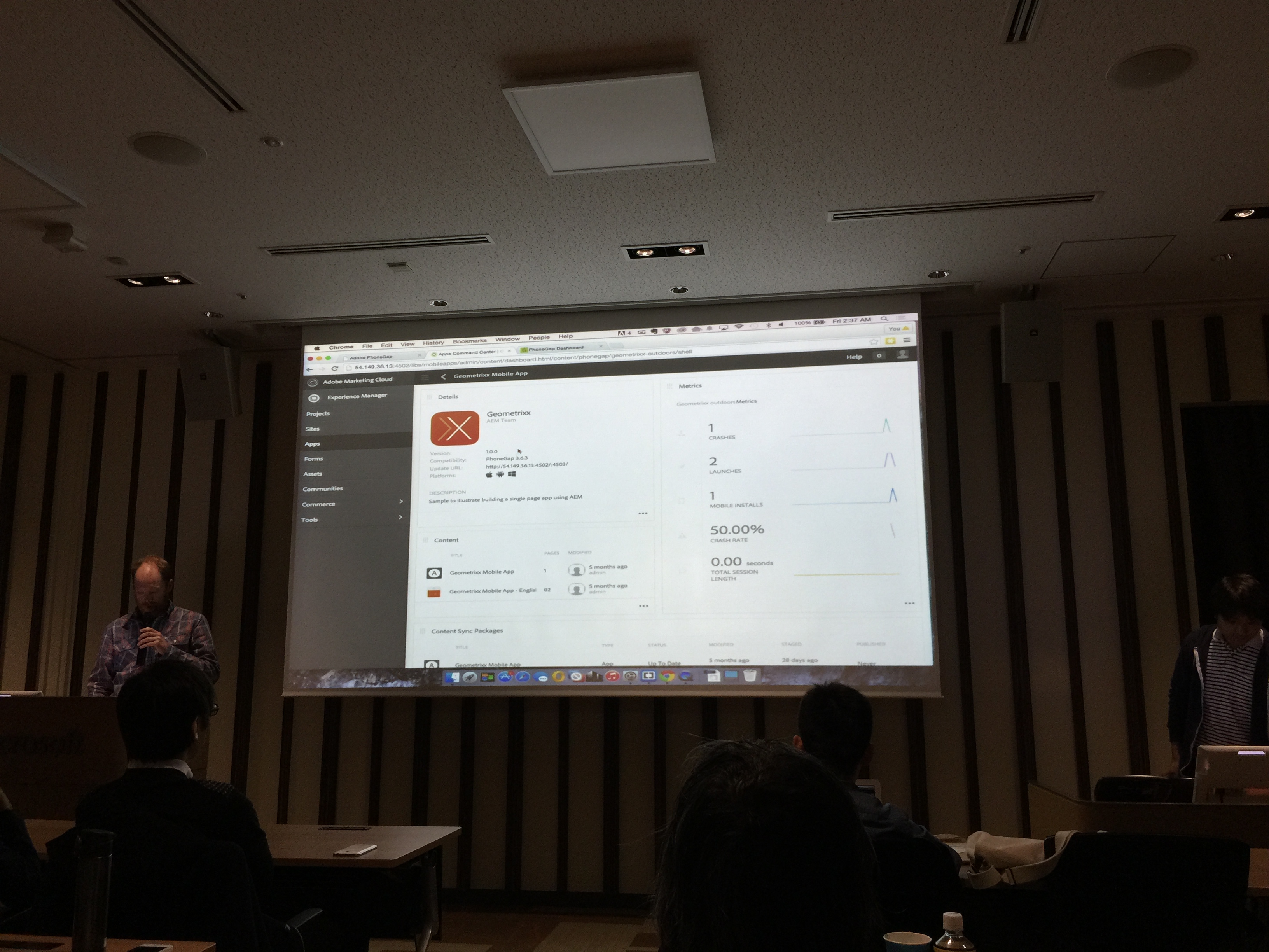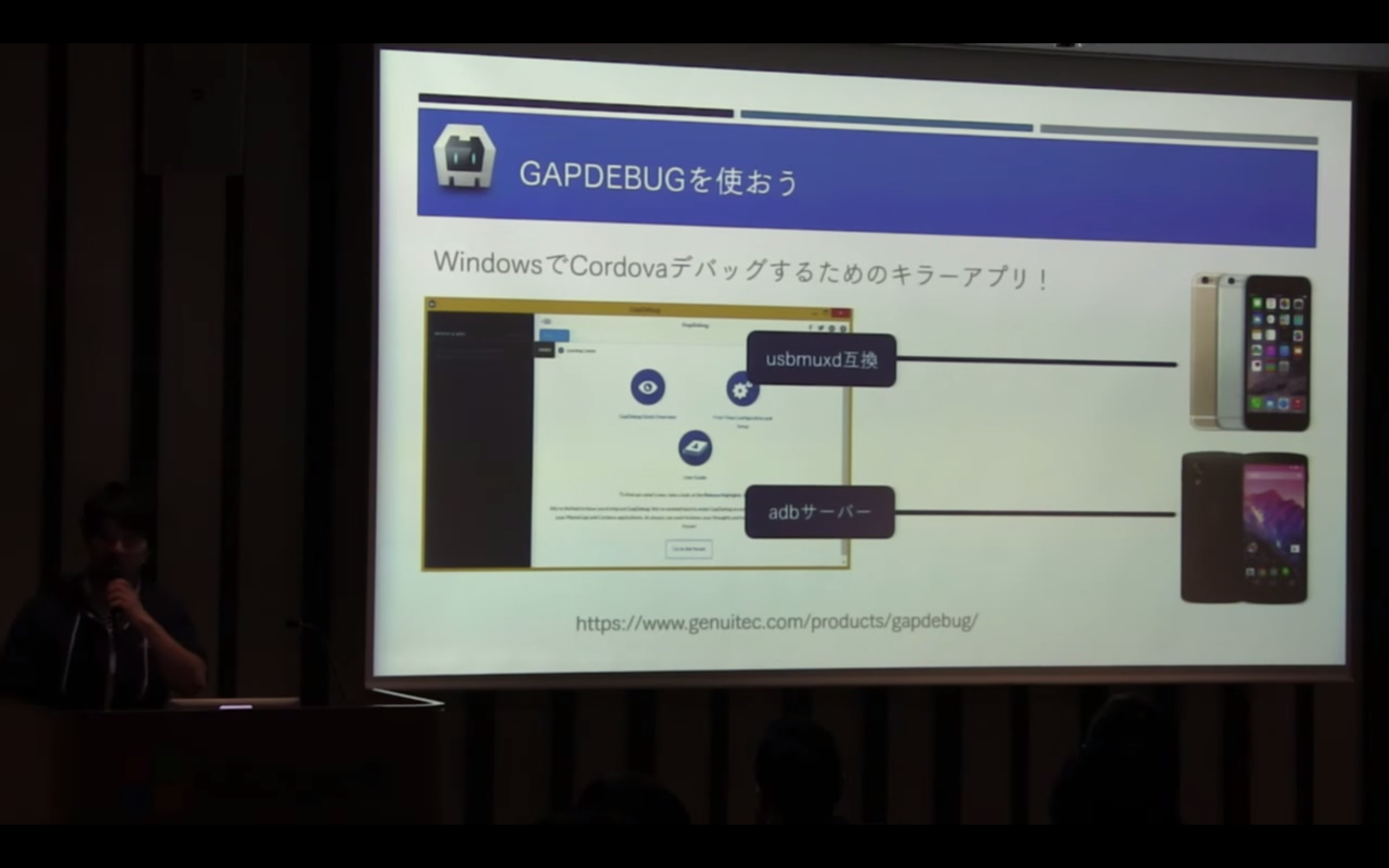 まず最初はAdobe社のAndre Charland氏の発表でした。彼は元々PhoneGapを開発していたNitobi社の創設者で、Adobe社に買収された後は米PhoneGapチームマネージャーを勤めています。つまりPhoneGapのすべてを知っている人と言えます。