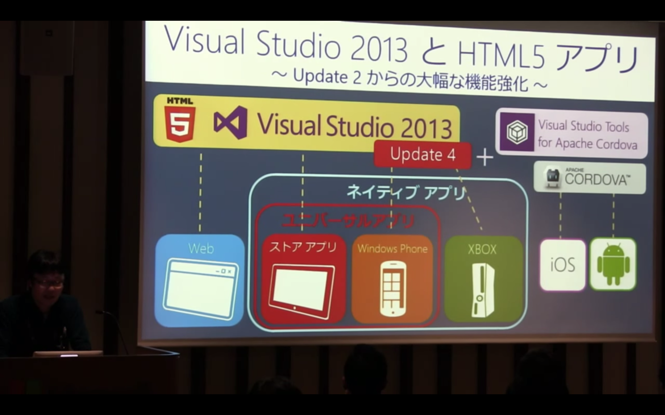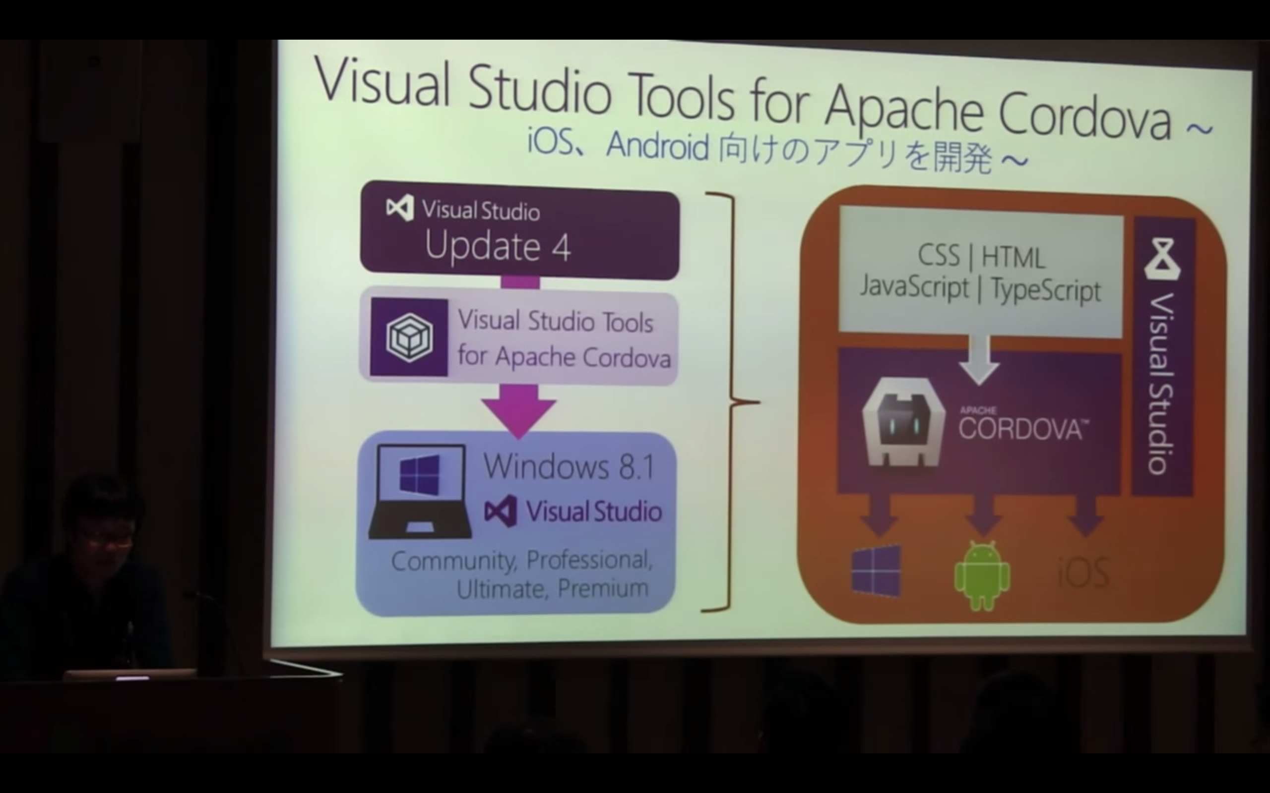 Visual StudioではHTML5/JavaScriptでアプリを開発できますが、ストアアプリ、Windows Phone、XBOXはHTML5/JavaScriptからネイティブコードに変換される仕組みになっています。そしてCordova開発はVisual Studio Tools for Apache Cordovaというアプリをインストールすると可能になります。こちらはVisual Studio 2015から今後デフォルトで入ってくるそうです。