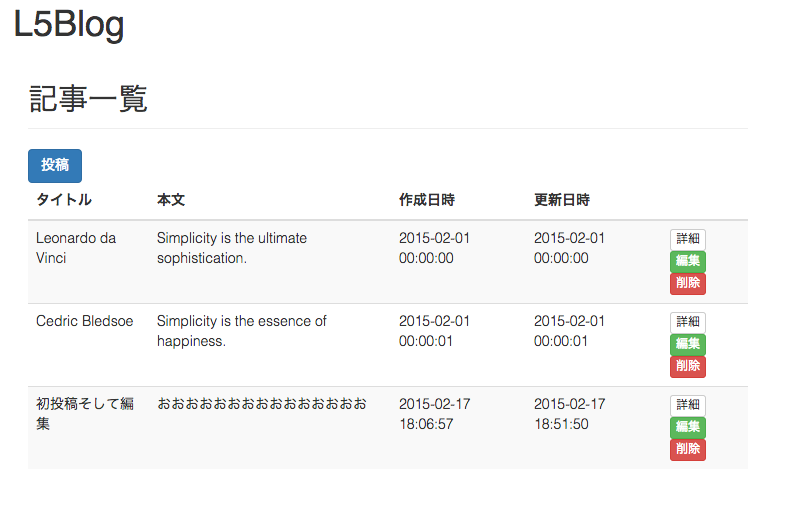 L5の基本機能を扱いつつシンプルなブログアプリを作ってみようと思います。