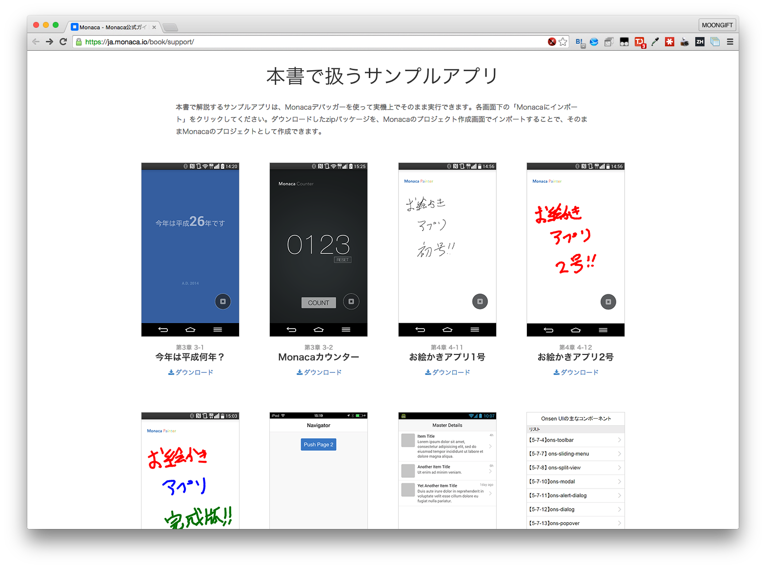 サンプルプロジェクトはMonaca - Monaca公式ガイドブック「クラウドでできるHTML5ハイブリッドアプリ開発」のページにてダウンロードができますが、今回はそのプロジェクトを使う方法を紹介します。