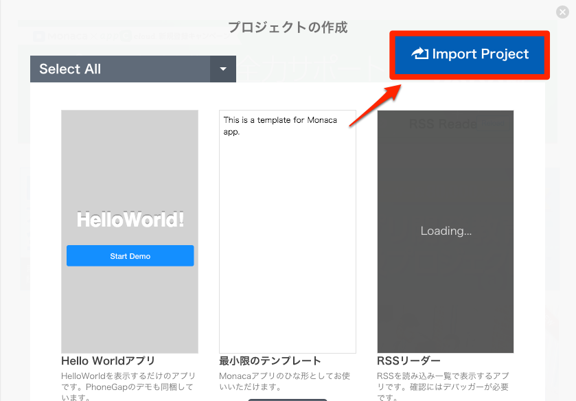 プロジェクトテンプレートが並んで いるのが確認できると思います。そして右上にあるImport Projectをクリックします。