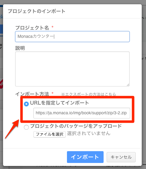 モーダルウィンドウが表示されます。その中のインポート方法で、URLを指定してインポートを選択し、先ほどコピーしたURLを貼り付けます。プロジェクト名は適当に決めてください。