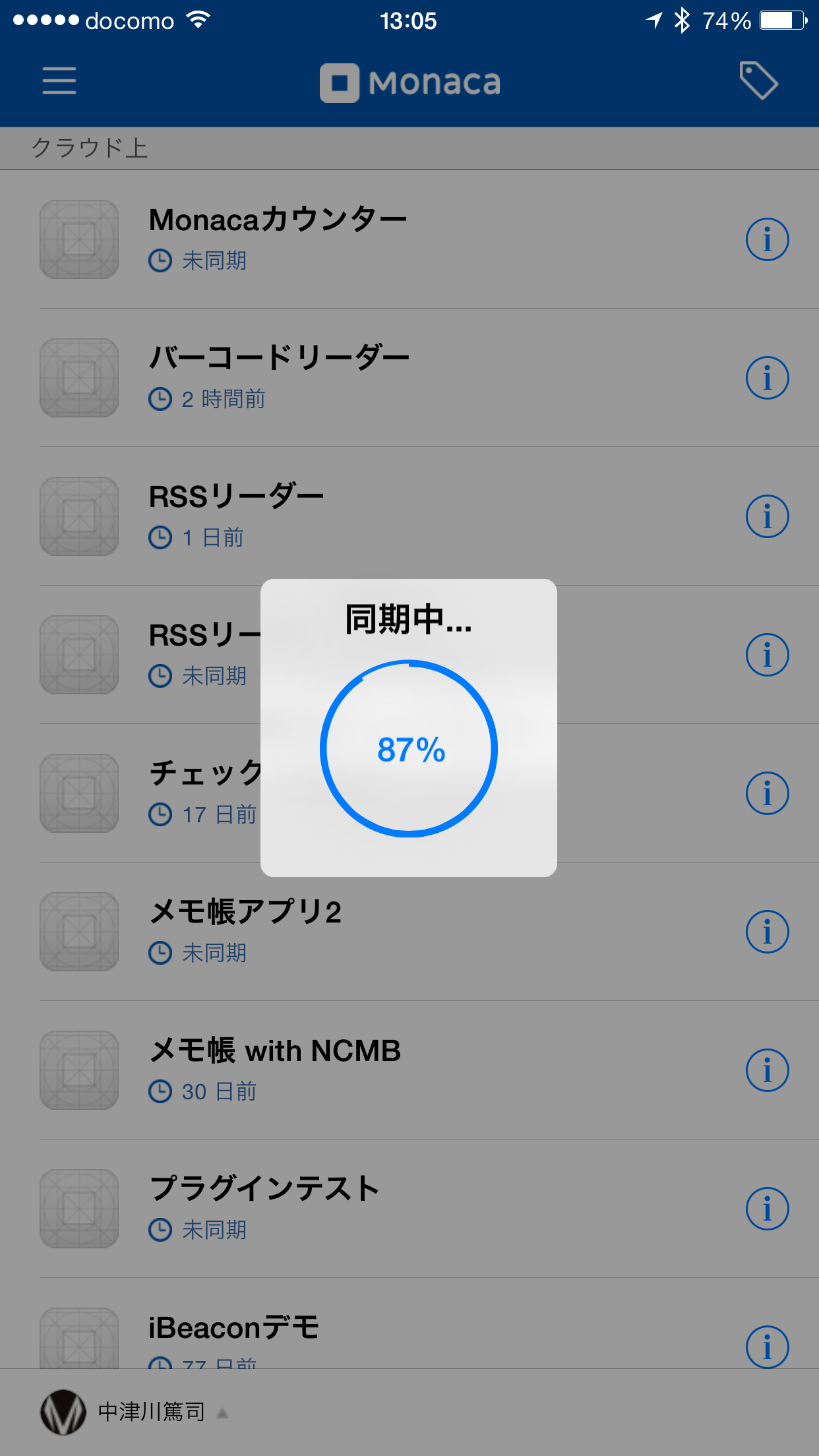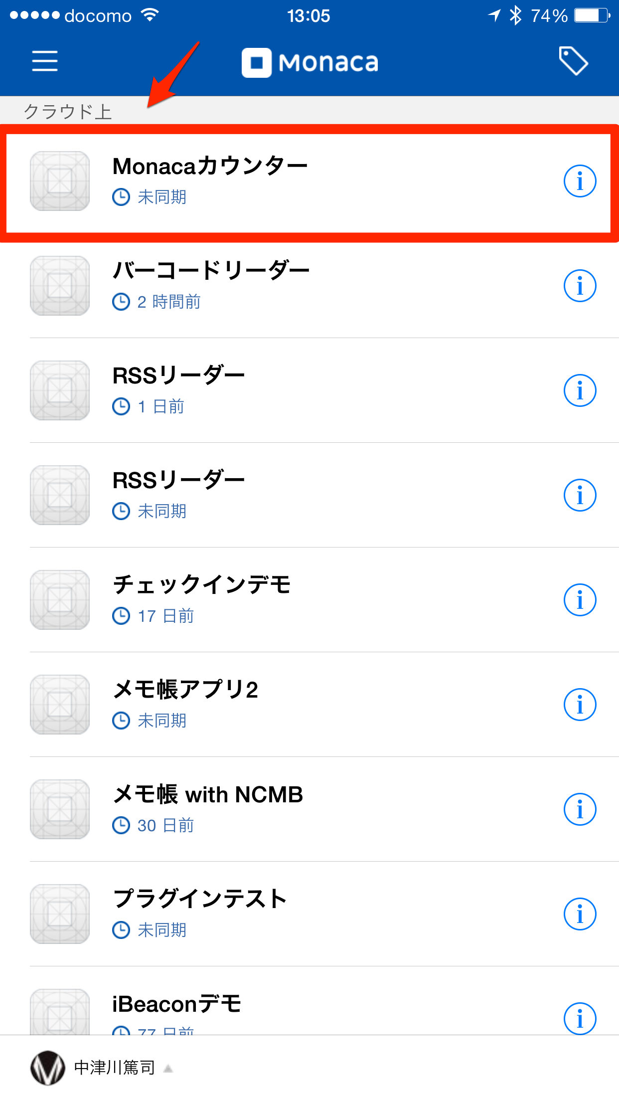 ログインすると先ほど登録したプロジェクトが表示されているかと思います。タップするとコードをMonacaクラウドからダウンロードし、実行します。