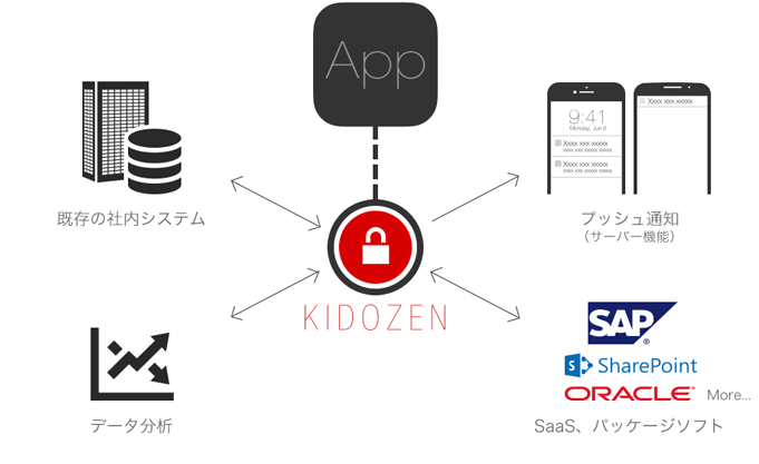 Monacaはエン タープライズ向けmBaaS(Mobile Backend as a Service)を提供するKidoZenと提携しています。そのKidoZenを使うことで、容易かつセキュアにモバイルアプリと既存システムとを連携させられます。
