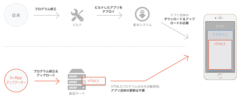 アプリのコンテンツをアプリストアを介することなくアップデートします。アプリの再配布のような手間がなく、常に最新のアプリを保つことができます。こちらはアプリのロジック暗号化とも組み合わせて利用が可能となっています。