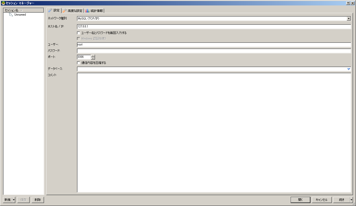 「Unnamed」セッションを選択して、接続したいデータベースの情報を入力します。