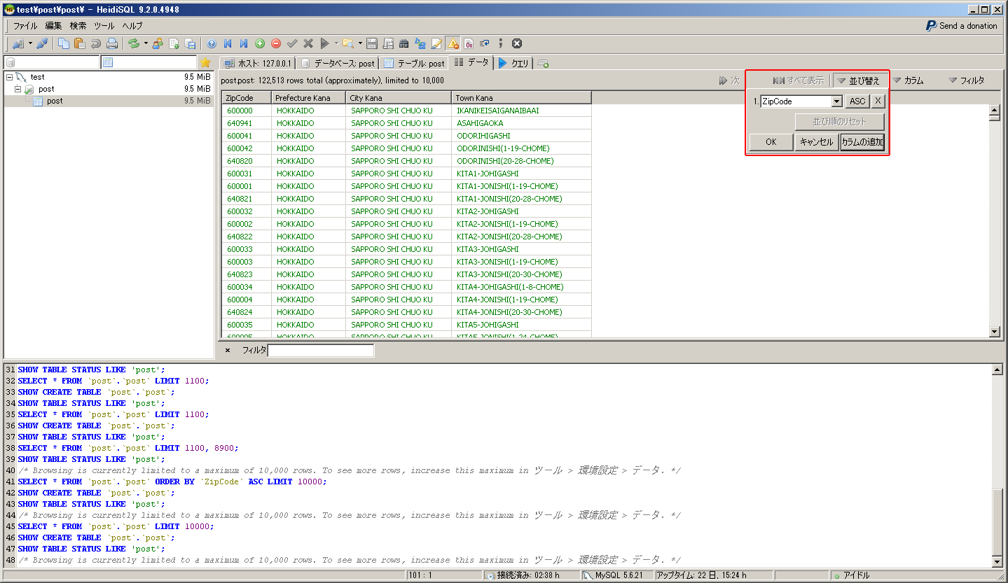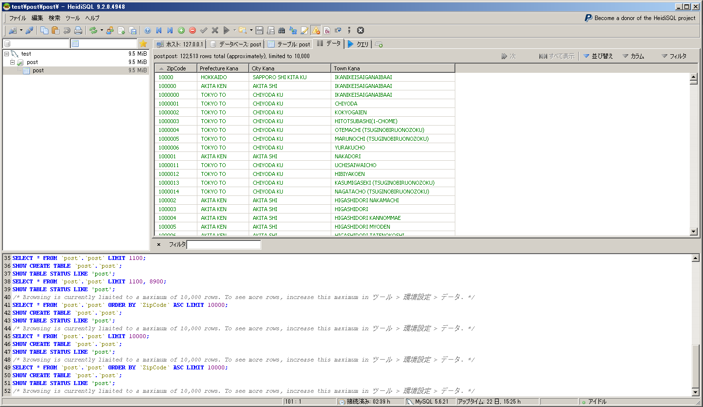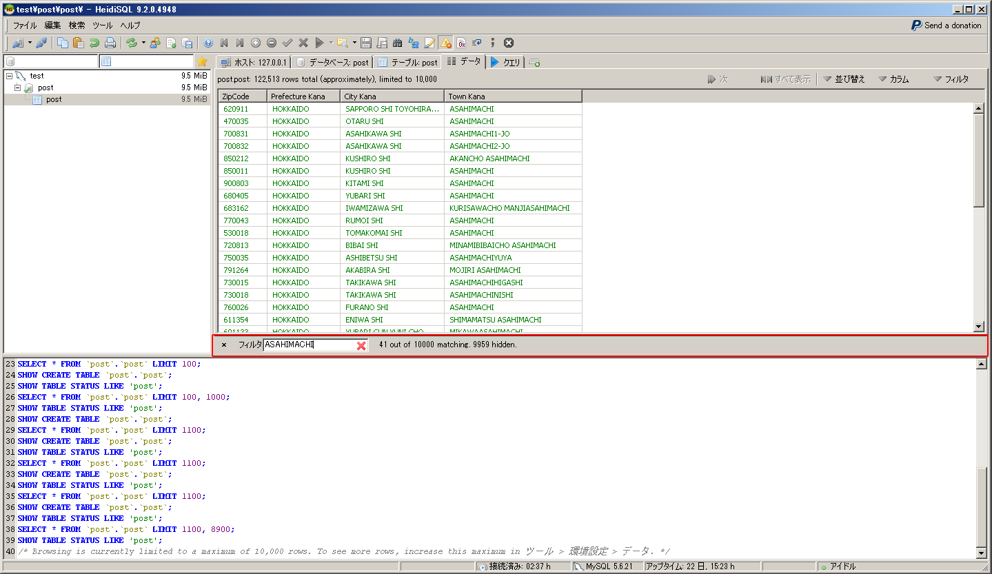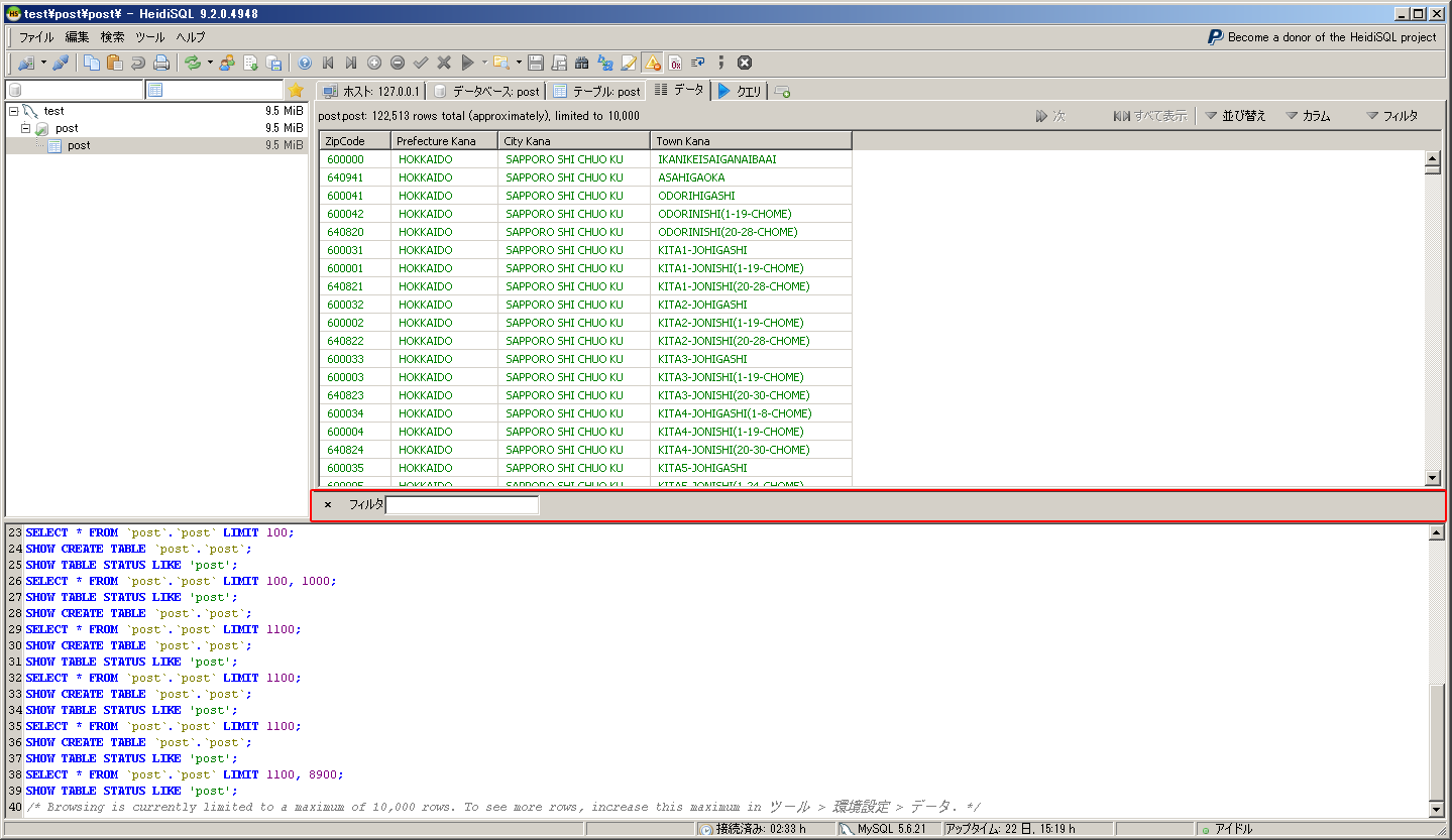 サンプルとして、郵便番号情報を格納した「post」テーブルを用意しました。約125000件のカラムが格納されています。