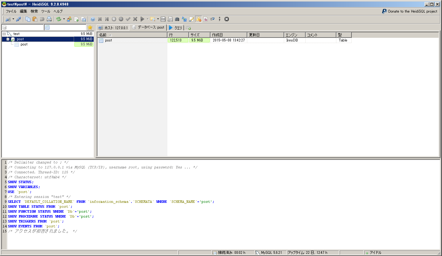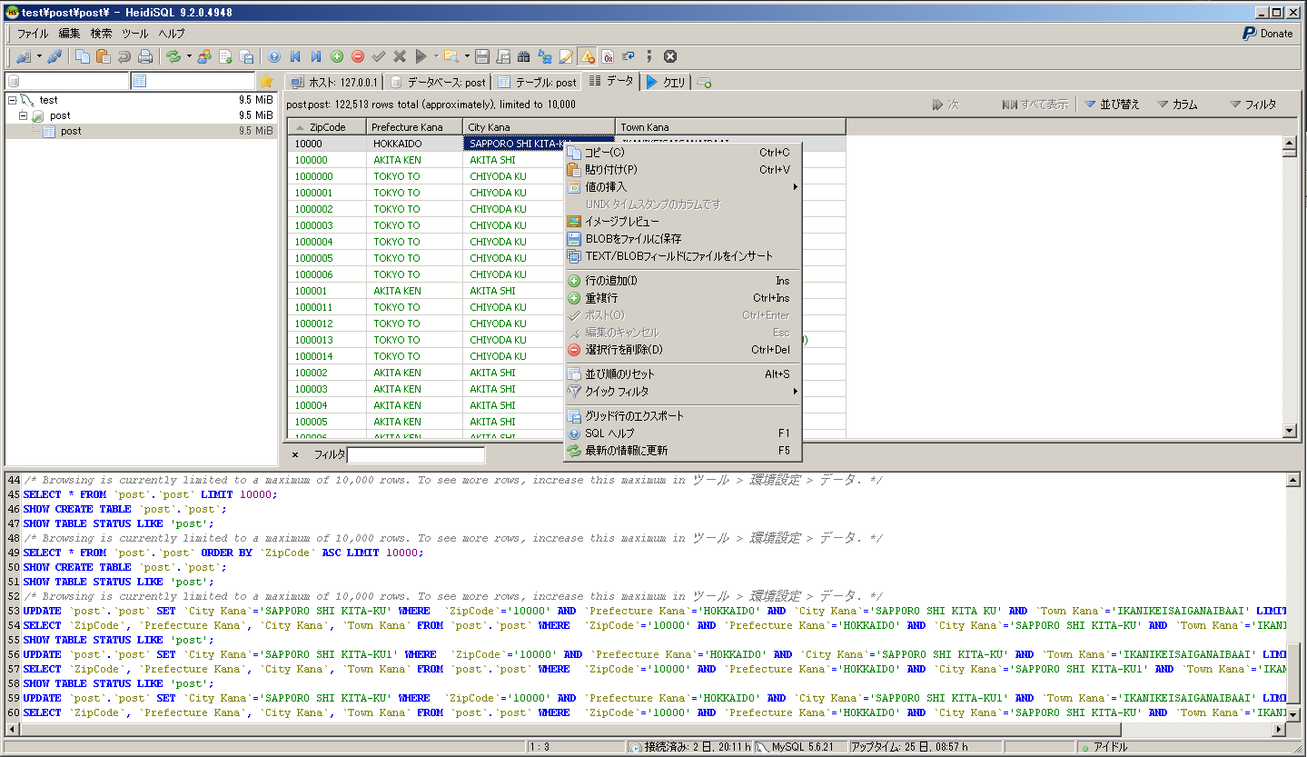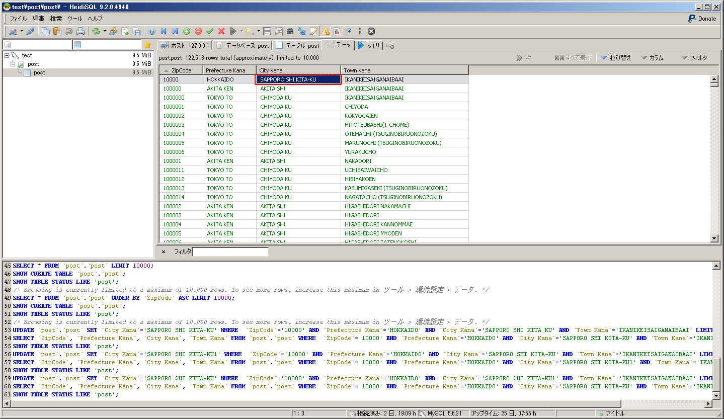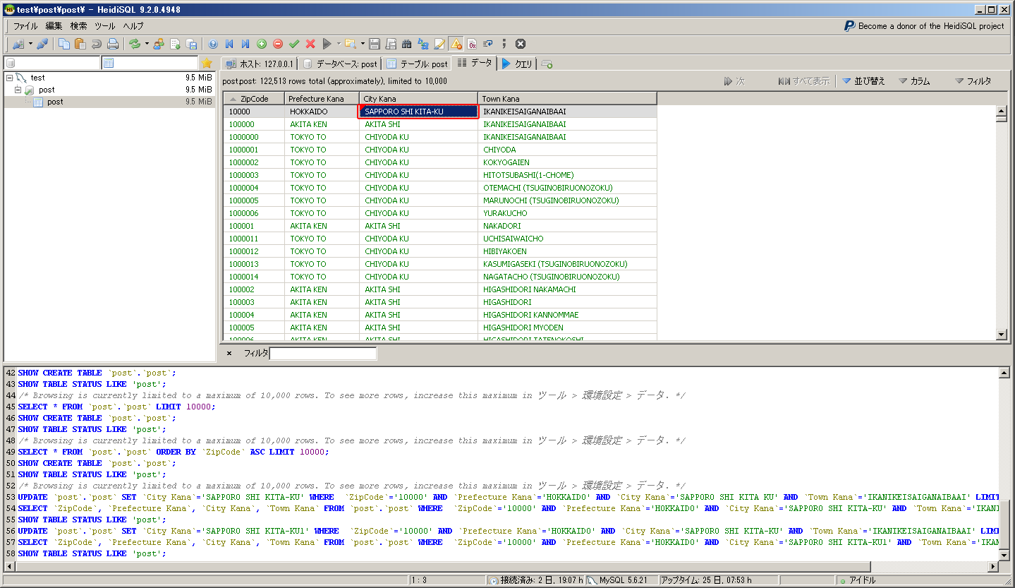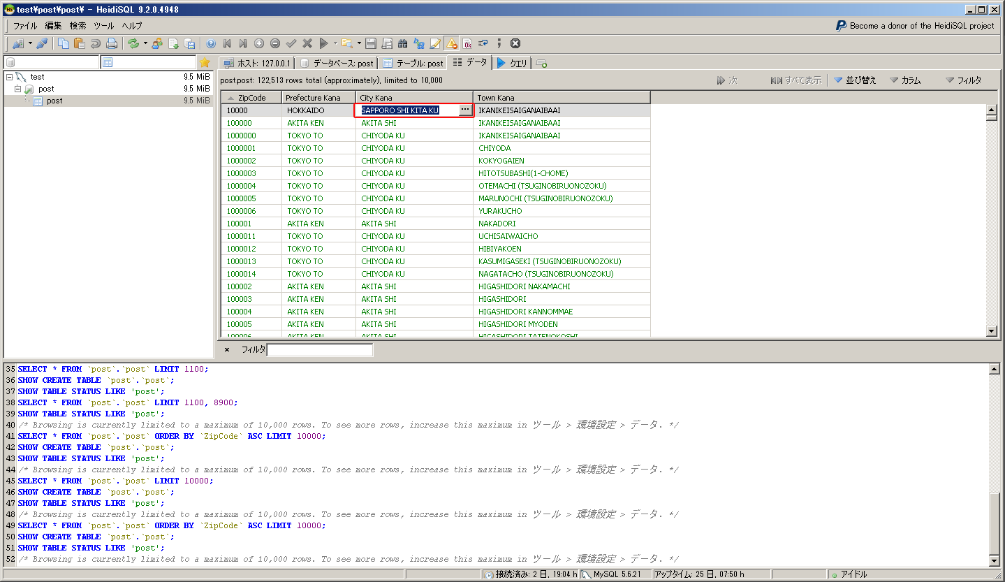 サンプルとして、郵便番号情報を格納した「post」テーブルを用意しました。約125000件のカラムが格納されています。