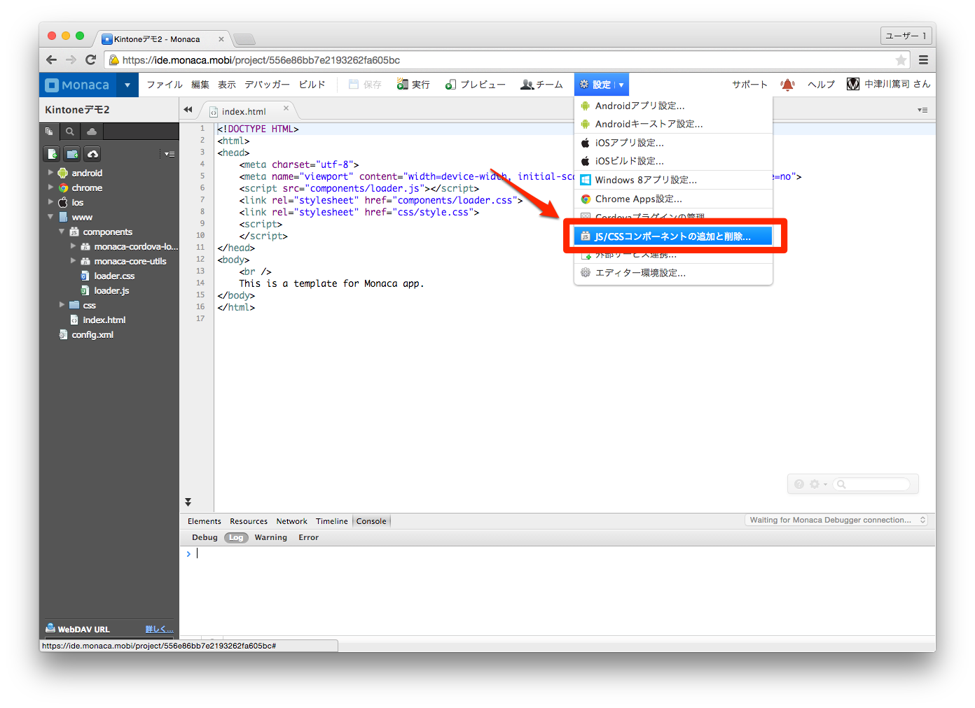 次に設定メニューのJS/CSSコンポーネントの追加と削除を選択します。