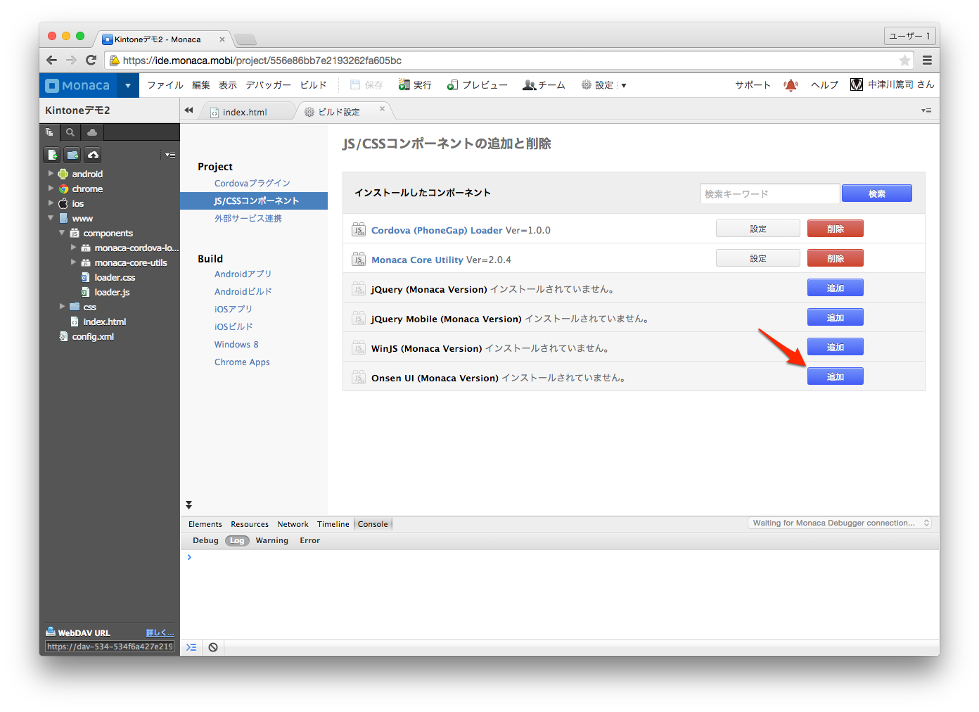 そしてOnsen UI追加してください。バージョンは最新版とします。