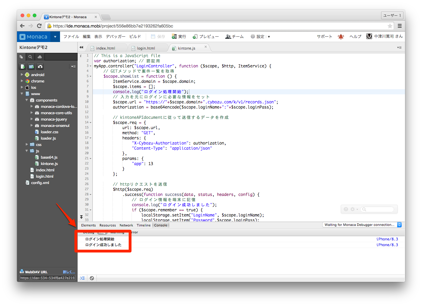 そうすると、コンソールのログに「ログイン処理開始」「ログイン成功しました」というメッセージが出るかと思います。KintoneのサーバがCORSに対応していないのでデスクトップブラウザのプレビューからではエラーが出るのでご注意ください。