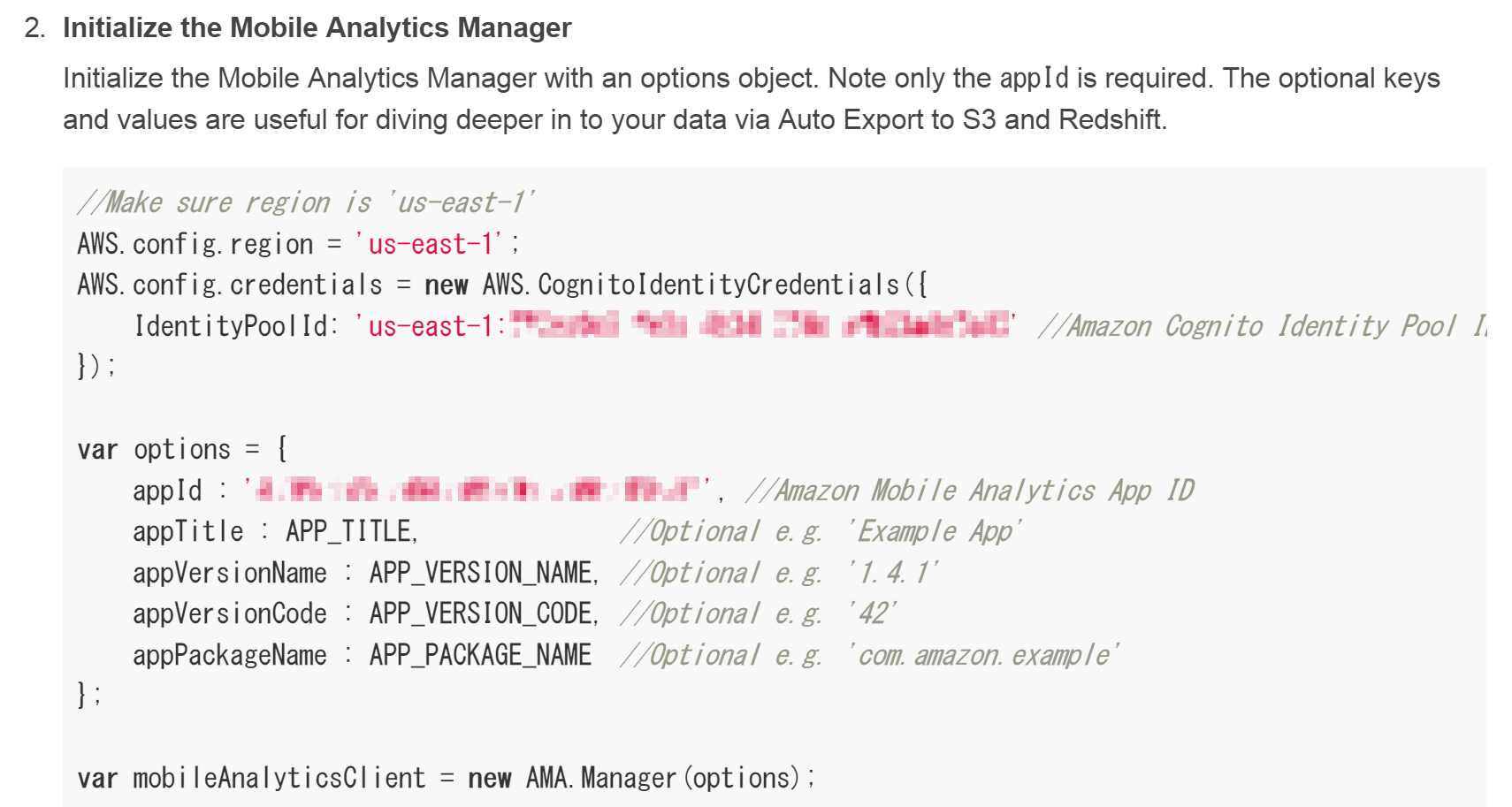 「2. Initialize the Mobile Analytics Manager」以下に記述されているソースコードをコピーしておきます。