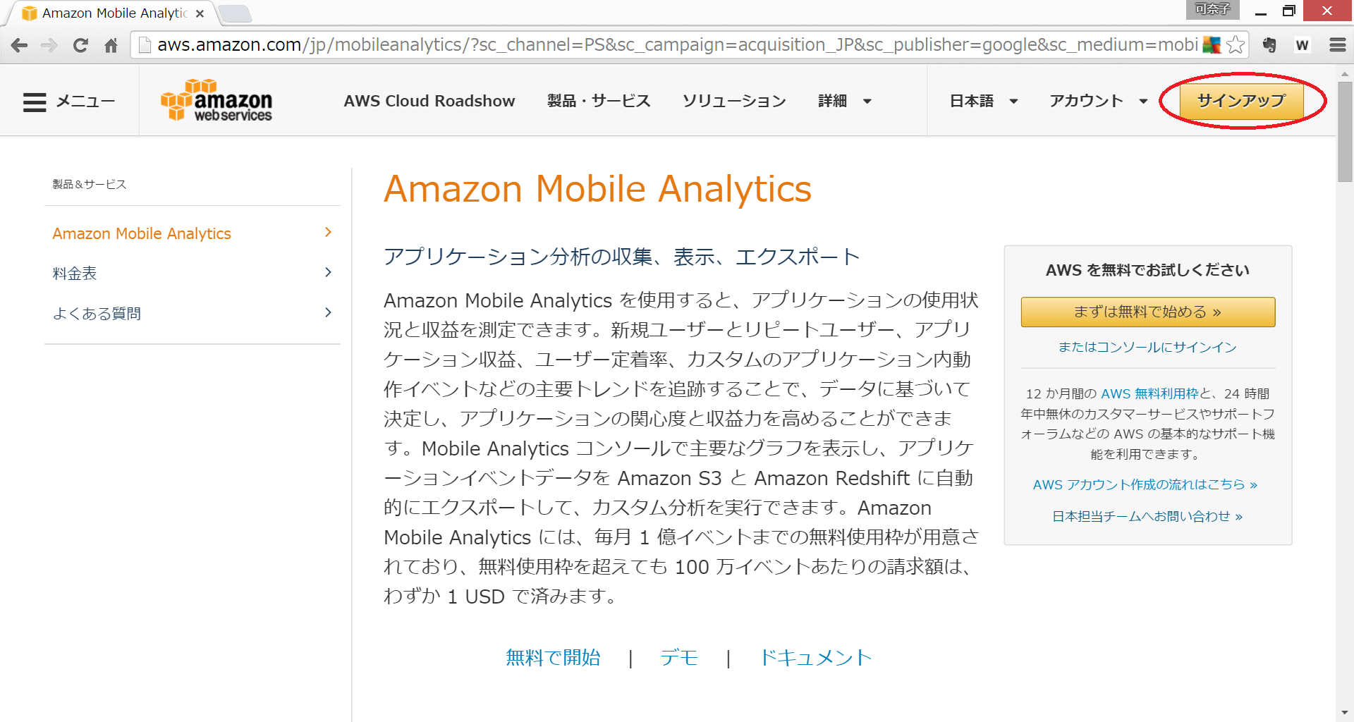Amazon Mobile Analyticsを利用するためにはAWSのアカウントが必要になります。