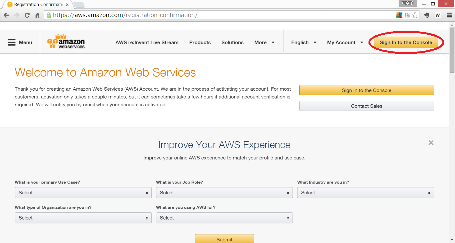 サインアップが完了したら、「Sign In to the Console」をクリックします。