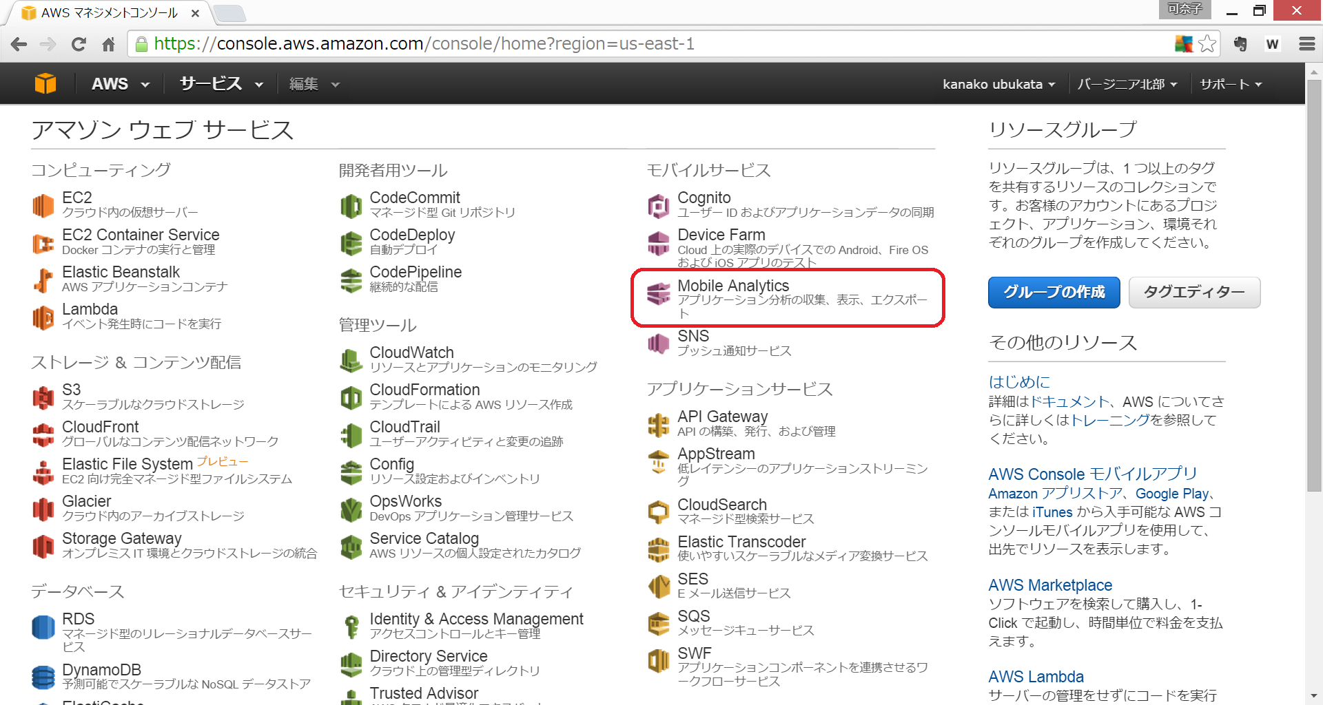 AWSのサービス一覧が表示されますので、「Mobile Analytics」を選択します。