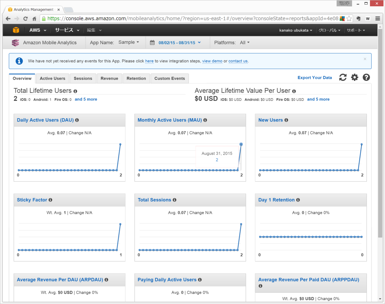 時間を置いてから、Amazon Mobile Analyticsの管理画面を開いてみてください。