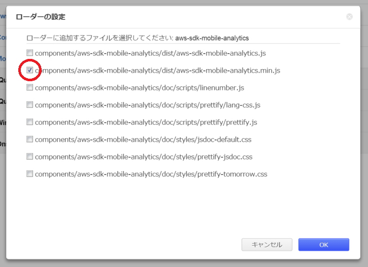 「aws-sdk-mobile-analytics.min.js」にチェックを入れ、「OK」をクリックします。