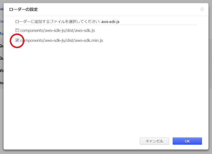次に「aws-sdk-js」の「設定」ボタンをクリックし、「aws-sdk.min.js」にチェックを入れ、「OK」をクリックします。